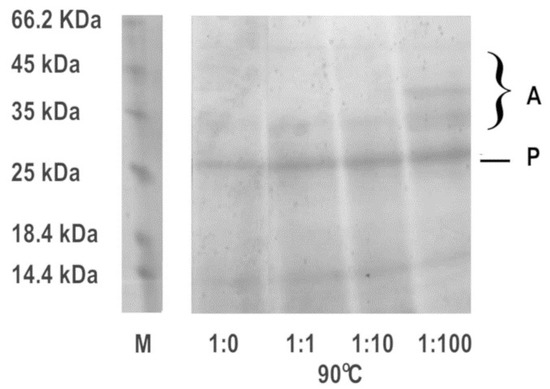 For SDS-PAGE analysis, 12% running gels and 4% stacking gels were prepared. Gels were prepared according to the original procedure [31]. Samples were prepared and run in denaturing and reducing conditions, as described by Markovic and coauthors [19]. To avoid disulfide reduction and acive-site regeneration, samples were prepared in non-reducing conditions (β-mercaptoetanol was not added to the sample buffer) by mixing 4 volumes of samples with 1 volume of 5× concentrated non-reducing sample buffer prior to boiling for 15 min. A total of 12 µg of protein per lane was applied.