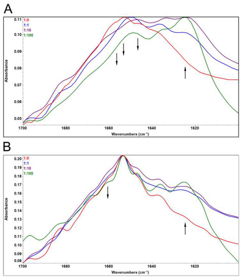 Treatment with DTT recovered most of the native-like structures, except the unordered band at 1660 cm−1, while the β-sheet band specific to aggregation at around 1623 cm−1 remained partly increased (Figure 4B).