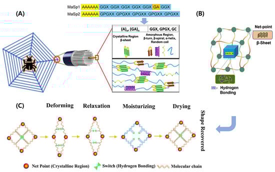 Structure–function relationships in spider silk. (A) Schematic of hierarchical and secondary structures. Amino acid motifs: A—Aniline; G—Glycine; P—Proline; X—random amino acid. (B) A shape memory structural model. (C) Net-point and switch model for moisture-sensitive shape memory mechanism. (A,B) adapted from Reference [], (C) adapted from Reference [].