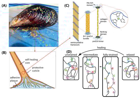 Structure–function relationships in the mussel byssus. (A) Mussels attach to surfaces with a byssus. (B) The component structure of mussel byssal thread. (C) Schematic of the multiscale structure in the core of mussel byssal thread. (D) Idealized molecular model of byssal thread deformation and healing. (A,B) adapted from Reference [], (C,D) adapted from Reference [].