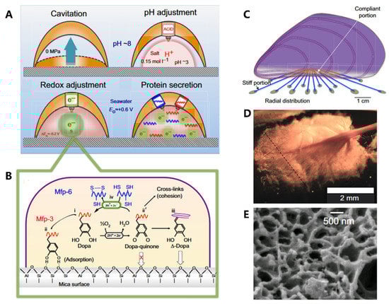The formation process of plaque and structure–function relationships in the mussel. (A) The formation process of cavitation, pH adjustment, redox adjustment, and protein secretion. (B) Redox activity is driven by the difference between the high pH and O2 concentration of seawater versus the low pH and abundance of electron donors in the plaque. (C) Radial distribution of threads. (D) The spatulate geometry of a byssal thread and plaque. (E) The trabecular (spongy) structure of plaque. Figures adapted from Reference [].