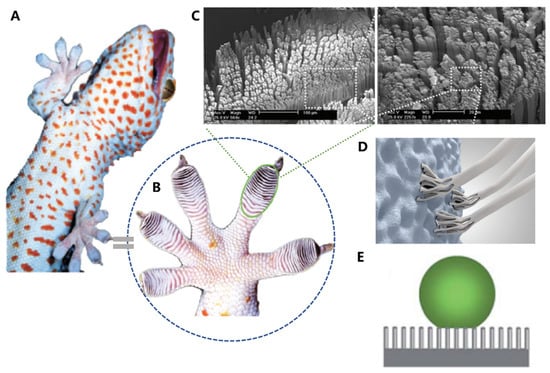 Geckos (Figure 6A) are fascinating animals found in warm climates, known for their specialized and multifunctional toe pads. These pads possess an efficient reversible adhesive system, which enables geckos to climb almost any surface whether it is rough, smooth, vertical, or inverted [,,,,,,,]. In the meantime, the pads also possess superhydrophobic surfaces. This combined performance of high adhesion and anti-fouling has inspired the development of engineering materials such as grabbing robotic hands.