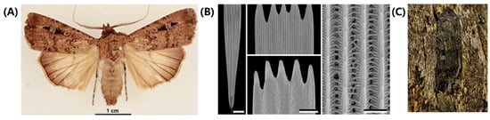 Lepidopterans’ wing color is determined by both pigment and structure, which enables them to achieve their camouflage function [,,,]. In this part, we provide a detailed explanation of how the multi-scale structure of a moth’s wings helps it achieve camouflage. Bogong moths (Agrotis infusa) are a species of nocturnal moth notable for their seasonal long-distance migration to the Australian Alps and are shown in Figure 7A []. This species undertakes two migrations each year, in the spring and autumn, traveling up to 1000 km to reach their summer and winter habitat. The Bogong moth precisely navigates over such long distances, relying on visual cues and the Earth’s magnetic field for navigation. Research suggests that the moth’s reliance on visual cues and the Earth’s magnetic field for navigation is remarkable. In addition to their unique brownish hue, Bogong moths are also known for their ability to blend in with their surroundings during the day, making them less visible to potential predators in the open plains they traverse.
