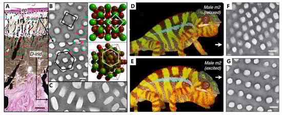 Structure and function in chameleons. (A) Hematoxylin and eosin staining of a cross-section of white skin showing the epidermis (ep) and the two thick layers of iridophores. (B) TEM images of guanine nanocrystals in S-iridophores in the excited state and three-dimensional model of an FCC lattice. (C) TEM image of guanine nanocrystals in D-iridophores. (D) The overall color and (F) epidermal structure of Male m2 in a relaxed state (E). The overall color and (G) epidermal structure of Male m2 in an excited state. Scale bars, 20 mm (A); 200 nm (B,C,F,G). Figures adapted from Reference [].
