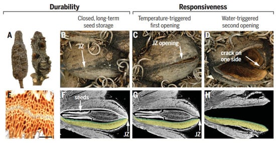 Structure and function of Banksia attenuata. (A,D) Cones from the North [(A), left side] contain mainly closed follicles (B). Half-open (C) and open follicles (D) are frequently found on cones in the South, where opening temperatures are lower [right infructescence in (A)]. (E) Light micrograph of a junction zone (JZ) sealed with wax (scale bar 100 mm). (F,H) Virtual cuts through micro-tomographic reconstructions of closed (F), half-open (G), and open follicles (H) showing the seeds with the separator in between [(F,G)] and the endocarp–mesocarp bilayer (colored in green and yellow in one of the two pericarp valves). The white line in (F) indicates the internal valve curvature, which changes with geographic location and climate. Figures adapted from Reference [].