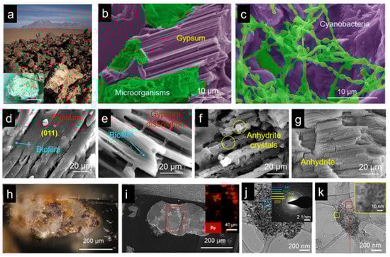 Cyanobacteria living in the Atacama Desert, Chile. (a) Gypsum rocks in the Atacama Desert. (b,c) SEM micrographs show cyanobacteria colonies in the gypsum rocks. (d–g) The process of gypsum dissolution and phase transformation under the biofilm of the cyanobacteria colony. (h,i) Magnetite and hematite minerals were found in the gypsum rocks. (h–j) TEM images show magnetite dissolution and phase transformation. (a–g) adapted from Reference [], (h–k) adapted from Reference [].
