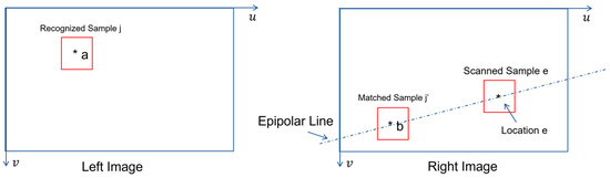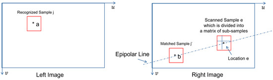 Subsequently, in the so-called right image, we could determine a line (i.e., equivalent to epipolar line) which will guide the search for the best match candidate.