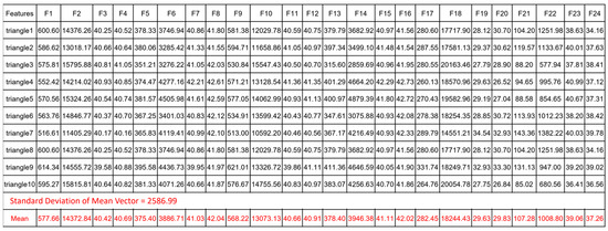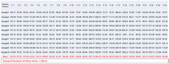 For each sample image in Figure 10, we calculate its feature vector in time domain. Here, we share the results of feature vectors computed from the ten image samples of triangle in Figure 11. These results are shown in Figure 12, which also gives the result of the mean vector and its standard deviation.