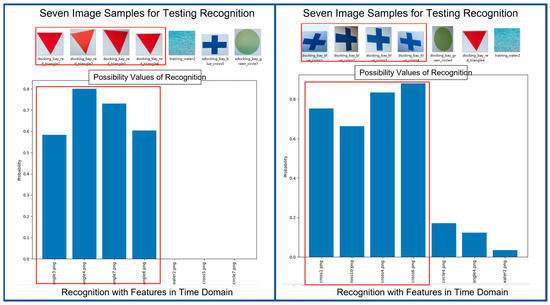 Figure 15 shows two examples of results of recognition in time domain. Each example contains seven image samples as input. Among these seven inputs, three of them are totally out of the class dedicated to the pair of cognizer and recognizer. We can see that recognition module performs quite successfully in recognizing the correct entries. Please take note that the feature vectors of image samples at input are all in time domain.
