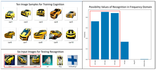 By now, people may ask whether the proposed new principle could work well with other more complex entities. For the sake of responding to such doubt, we give two more examples of results which make use of the feature vectors in frequency domain to do cognition and recognition. For each reference entity (e.g., car and dog), the cognition module is trained with ten image samples while the recognition process is tested with six image samples as input.