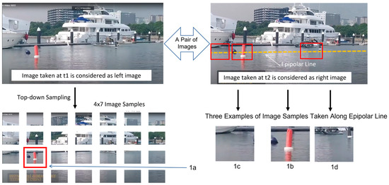 Now, we could start the process of stereo matching. As shown in Figure 20, the first step is to do image sampling. When the so-called left image is sampled into a matrix of 4 × 7 image samples, the occurrence of a red floating post could be recognized. Please take note that the image sample of this recognized occurrence is named as image sample 1a by our testing program.