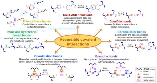 In 2008, Cordier P. et al. pioneered the development of autonomous elastomers that can self-heal at room temperature (RT) via reversible hydrogen bonds [29]. The reversible chemical interactions used in such SH materials are classified as covalent and non-covalent bonds [3,6,10,14,16,30,31,32,33,34].