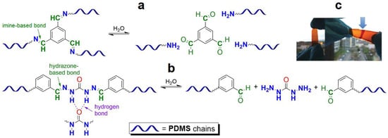In 2013, Roy N. et al. [89] prepared supramolecular networks with multiple hydrogen bonds by polycondensation of isocyanate-terminated PDMS with carbonylhydrazine (Figure 10a). This synthetic method can provide a wide range of materials with different flexibility, by proper selection of the bis-isocyanate component forming the polymer backbone. Such samples autonomously heal within a few hours. However, the polymers lose their SH properties if the cut samples are stored in the air for more than 10 min [12].