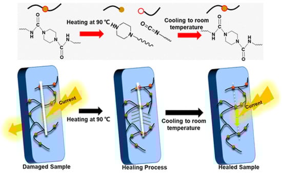 Dynamically hindered urea bonds were utilized [60] to create a smart insulating material with non-autonomous SH ability for powered and electronic devices. According to the ref. [60], such SHSMs were constructed by isocyanate–piperazine-based dynamic bonds with a cross-linking degree adjusted by glycerol. It caused not only healing the cut-damaged feature of the silicone, but also enabled dielectric property recovery after electrical breakdown (Figure 5). The obtained materials exhibit a η of above 95% and a recycling efficiency above 90%, based on insulation performance (after healing at 90 °C).