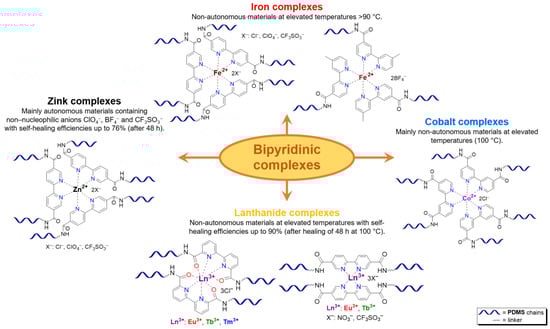 Bipyridinic PMCs. One of the first prepared PMCs based on PDMS and a metal cation was bipyridine-containing SHSMs. In 2016, the scientific group of Bao Z. [61] firstly obtained a SH dielectric elastomer by metal–polymer ligand coordination acting as cross-links of PDMS chains (Figure 6). The polymer ligand was poly(2,2′-bipyridine-5,5′-dicarboxamide-co-PDMS), and metal salts are Fe2+ and Zn2+ with different anions (BF4−, ClO4−, CF3SO3−). The flexibility of PDMS chains provides a sufficiently high mobility in the 3D polymer network structure to enable reversible coordination of metal ions and bipyridine at RT. The kinetically labile coordination between Zn2+ and bipyridine allows the silicone rubber to SH rapidly and autonomously at RT. Thus, the η of Zn(CF3SO3)2-PMC is ca. 76%, while the η of Zn(ClO4)2-PMC and ZnCl2-PMC are 55 and 21%, respectively. Compared to the labile Zn2+-based PMCs, Fe2+-based bipyridinic PMCs demonstrated non-autonomous SH upon heating to 90 °C for several hours, due to the kinetically inert coordination of Fe2+–Nbipyridyl at RT, and the overall contribution of the higher mobility of PDMS chains and the more labile coordination of Fe2+–Nbipyridyl at elevated temperatures [61]. The described obtained SHSMs were used in flexible electronics, for example, to produce artificial skin (“electronic skins”) and artificial muscles [12].