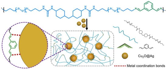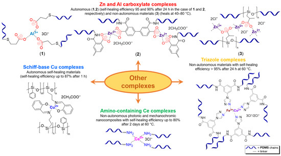 In 2017, Yu D. et al. [74] used the metal center to Cu2+ to obtain PMCs by the reaction between poly((3-aminopropyl)methylsiloxane-co-methylphenylsiloxane)s and salicylaldehyde-forming imine groups, then complexation of the obtained ligand with Cu(CH3COO)2 (Figure 8). The dynamic character of the metal–polymer ligand interactions of copolysiloxanes with pendant Schiff base-groups with Cu2+ in a SHSM caused a high ability for autonomous SH at 30 °C (η = 87% after healing for 1 h) [12].