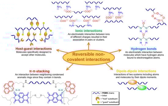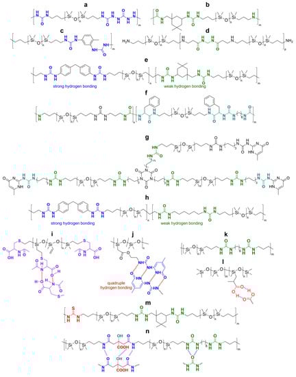 Hydrogen bonding is the most common reversible interaction used to form SHSMs [88,89,90,91,92,93,94,95,96,97,98,99,100,101,102,103,104,105,106,107] (Figure 10). The hydrogen bonds are chemical bonds between an electronegative atom (N, O, or F) and a hydrogen atom covalently bonded to another electronegative atom. The hydrogen bonds are characterized by their relatively low energy (an order of magnitude lower) in comparison with the covalent bonds discussed before. The hydrogen bonds occupy an intermediate position between chemical bonds and van der Waals forces. Since hydrogen bonds are intermolecular bonds, they cause the formation of dynamic cross-links between macromolecules, especially PDMSs containing polar groups. The hydrogen bonds are highly directional and can initiate self-assembly of polymer chains [12].