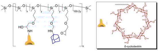 In 2023, Daichi Y. et al. [114] obtained copolydimethylsiloxane with fragments of adamantane and beta-cyclodextrin methyl ether, the interaction between which formed the basis of reversible cross-linking (Figure 12). The paper notes that the resulting silicone material has a low ε (up to 76%), as well as a low η (30% at RT for 24 h).