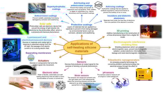There are a number of reviews on PDMSs [18,22,23,24,25,26,27,28] and self-healing silicone materials (SHSMs) [3,6,18] in which SH mechanisms are preferably described. However, over the past five years, there was a revolutionary step in the development of functional SHSMs aimed at expanding practical areas of their application. Therefore, the main purpose of this review is a brief analysis of previously studied SHSMs (“looking back”), and those developed over the past 5 years, especially from the point of view of the use of functional SHSMs (“moving forward”).