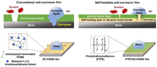 In 2023, Lee J.M. et al. [54] used reversible imine bonding of aminopropyl-terminated PDMS and benzene-1,3,5-tricarboxaldehyde to fabricate corrosion-resistant coatings with SH ability. Both unscratched and healed coatings maintained outstanding corrosion inhibition efficiencies of up to 99%. In the last few years, some imine-based functional SHSMs have been prepared by some other authors [12,55,56,57].