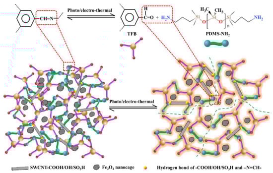 In 2016, a method to prepare a SH polymer film via a thermally reversible interaction between a furan-modified polyurethane and a maleimide-containing hyperbranched polysiloxane was investigated by Fu G. et al. [39]. Modified carbon nanotubes were incorporated to the silicone matrix to obtain an electrostatic-dissipative SHSM with η = 93% after healing at 130 °C for 5 min. The resulting films have been reported [39] to have high opportunities for applications in the aerospace industry, electronics and other related fields [12].