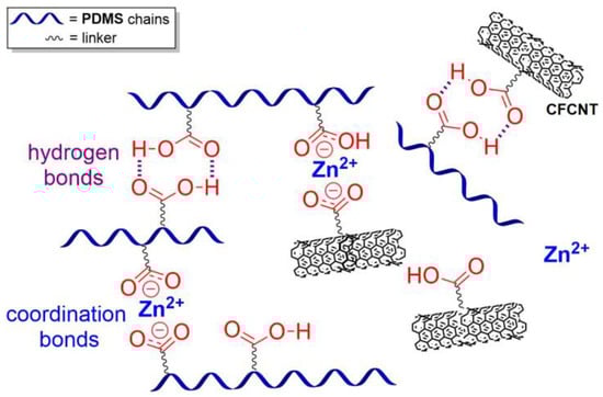 The conditions required for the formation of coordination bonds between a copolysiloxane ligand and metal ion are relatively mild, which causes coordination cross-linking of polymer chains and the obtaining of polymer-metal complexes (PMCs). One of the important proses of this approach is that the mechanical and SH material’s properties can be relatively easily controlled by changing (i) the structure of the copolysiloxane ligand via changing the type of ligand-forming fragments (donor atoms—O, N, etc., carboxylate, mono-, bi-, terpyridine fragments, etc.), (ii) the molecular weight of the copolysiloxane ligand or PDMS chain length, (iii) the metal–polymer ligand ratio, and (iv) the metal ion and counterion content [12].