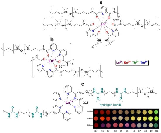 - Miroshnichenko, A.S.; Deriabin, K.V.; Baranov, A.I.; Neplokh, V.; Mitin, D.M.; Kolesnikov, I.E.; Dobrynin, M.V.; Parshina, E.K.; Mukhin, I.S.; Islamova, R.M. Lanthanide(III)-Incorporating Polysiloxanes as Materials for Light-Emitting Devices. ACS Appl. Polym. Mater. 2022, 4, 2683–2690. [Google Scholar] [CrossRef]
