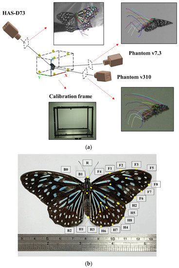 (a) Three high-speed cameras record the real free-flying butterfly, and a calibration frame is used to construct the three-dimensional coordinates. (b) The characteristic points on the butterfly’s body and wings.