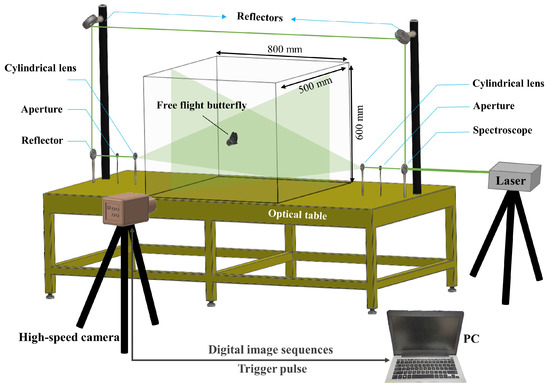 To gain a deeper insight into the flow structure of a butterfly, a particle image velocimetry (PIV) system was constructed to record the flow field surrounding the butterfly’s flight. The biological experiment in Section 2.1 and the PIV experiment were independent experiments. The instruments of the PIV experiment included a laser system (Sprout-G, Light-house Photonics Inc. San Jose, CA, USA), a spectroscope, a cylindrical lens, and reflectors. The cylindrical lens formed a laser beam with a wavelength of 532 nm into a light sheet that lightened the specified stationary flow field. Parts of the area might be shaded when the wings of the butterfly pass through the light sheet. This disadvantage might cause inaccuracies in the calculated flow field; thus, in order to solve this problem, a spectroscope was used to divide the laser source into two beams. The two laser beams were projected toward each other on the setting of three reflectors (Figure 2). The beams passed through the separate cylindrical lens, overlapped each other, and formed a single light sheet. The apertures were set between the reflectors and the cylindrical lens to adjust the thickness of the light sheet to be about 1 mm in the experiment.