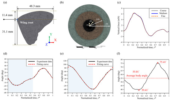 (a) Size of the wing model with face sizing; (b) the fluid domain was divided into four regions of varied grid numbers. The inner region had the greatest mesh grid density; (c) grid convergence test among coarse grid (4.2 million), medium grid (9.1 million), and fine grid (14.1 million). (d) The wing-pitch motion; (e) the asymmetric flapping motion, where the transfer of the downstroke and upstroke occurred at t* = 0.55. The downstroke period is depicted on a light blue background. (f) The variation in the body angle throughout a cycle and three specific body angles are indicated.