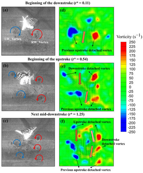 Flow visualization of a hovering butterfly and the calculated flow field and vorticity at (a) the beginning of the downstroke, (b) the beginning of the upstroke, and (c) the next mid-downstroke. (d–f) represent the calculated vorticity in contrast to (a–c), respectively.