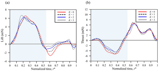Table 2 and Figure 8b show that differences in the average values of thrust exist between K = 2 and 3 during the upstroke. When K = 3, the mean thrust decreased during the upstroke, but the lift still increased. When K = 2, the cambered wing generated less negative thrust and negative lift during both the downstroke and upstroke. The thrust, however, decreased when K = 3, and the pressure distribution on the wing was almost the same as when K = 2 during the upstroke. It is worth noting that K = 3 had more camber deformation during the upstroke, as shown in Figure 4b and Figure 9. The curvature of the leading edge of the wing diverted the horizontal force to the vertical direction during the upstroke, resulting in the jet flow being directed downward. This effect was also found in a previous study [43].