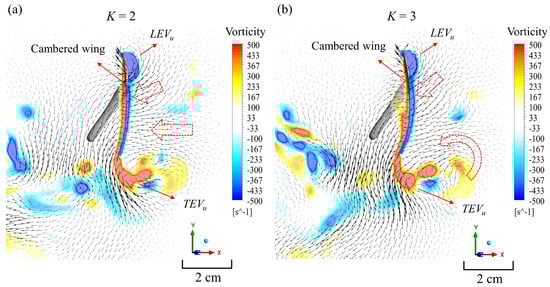 Vorticity and velocity vectors of (a) K = 2 and (b) K = 3 are shown in the plane of position r2 at the middle of the upstroke (t* = 0.75). The red arrows indicate the change in the vector direction as the wing undergoes a more cambered formation.