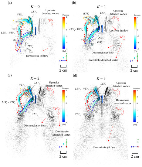 An increase in K enhances the mean lift, as mentioned earlier. In short, the relation between the direction and magnitude of the jet at the end of the flapping cycle is shown in Figure 10. LEVu (where u indicates the vortex formed in the upstroke) and TEVu merged on the ventral side of the wing. LEVu detached and combined with WTVu (wing-tip vortices) and formed a complex structure of LEVu-WTVu at the wing tip. These detached vortex structures formed a vortex ring and played an important role in generating lift and thrust during flight, similarly to those in previous studies [11,12,19,20,44]. This implies that the stable attachment of LEV leads to a strong and efficient vortex structure, resulting in the wing producing a more conducive force [12,19,26]. Figure 10a–d show that increasing the K value results in more jet flow and a greater downward force during upstroke and downstroke, leading to increased velocity generation. The figures also depict detached vortices during upstroke and downstroke, and it appears that the vortex size increased slightly as the K value increased. The phenomenon of an increasing downward jet flow is similar to that of an increasing body angle, and it also resembles the PIV experience mentioned in Section 3.2.