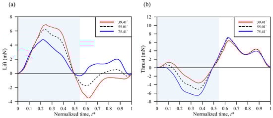 The different amplitudes of the wing deformations of (a) lift and (b) thrust in the simulation. The light blue background represents the downstroke period, while the rest represents the upstroke period.