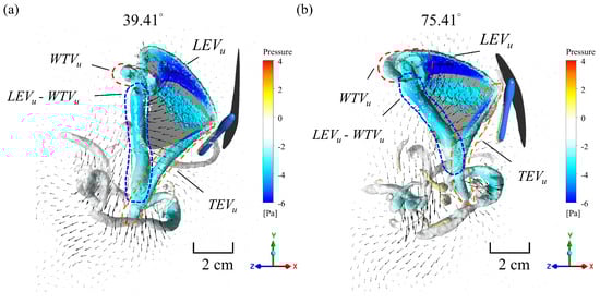 Velocity vector and pressure contour of three-dimensional vortex structure in cases with (a) a body angle of 39.41°and (b) a body angle of 75.41° at t* = 0.9. The Q criterion is used to determine the vortex structure: Q = 30(2Δϕf)2 = 80,870 s−2, which is 30 times the mean flapping angular velocity.
