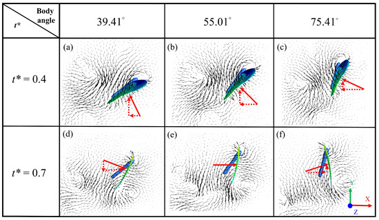 The thrust variation was significant during the downstroke between two different body angles, 39.41° and 75.41°, while the values varied in a relatively minor manner during the upstroke, as shown in Figure 11b. Figure 13a–c reveals that, when the body angle increased, the force projected in the vertical direction gradually reduced, and vice versa for the horizontal direction during the downstroke, resembling the results in Figure 11. Figure 13d–f illustrates that the force projection in the vertical direction markedly varied from downward to upward and turned the lift from negative to positive. In contrast, the projection of the horizontal force remained fairly constant and was not relevant to the body angles, as shown in Figure 11b at the normalized time of 0.7.