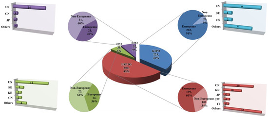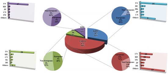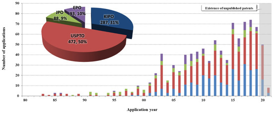 In terms of the status of patent ownership by each country for the target technologies, 472 patents were applied in the United States (USPTO) (50%), 287 in South Korea (KIPO) (31%), 88 (9%) in Japan (JPO), and 93 in Europe (EPO) (10%). Thus, the United States has applied for the largest number of patents regarding this technology. There were almost no applications from the beginning of the analysis period until 2000 in South Korea and the United States, but the number of applications surged after 2000, resulting in them leading the trend until 2019. South Korea (KIPO) appears to have applied for 287 patents in the target technologies. There were no patent documents from the beginning of the analysis period until 2000, but there has been steady growth from 2001 until 2019.