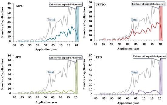 For patent analysis, it was searched for patents filed, disclosed, and registered in South Korea, the United States, Japan, and Europe from January 1975, when patent documents began to be documented, until December 2021. In terms of sheer numbers, Chinese patents are incredibly diverse and abundant, which could lead to distortions when conducting comparative analyses with other countries. It was not excluded from the analysis just because the number of Chinese patents was enormous, but when the trends in Chinese patents and patents of other countries were listed in the raw data analysis, the meaning of comparison was not apparent. Therefore, Chinese patents were excluded from the analysis in this study. It was performed for a patent search using the WINTELIPS search DB, an online patent search service developed by WIPS Co., Ltd. (Seoul, Republic of Korea) [33]. Patents searched in the patent database included not only registered patents for which the patent document was still valid but also patents in the publication, rejection, withdrawal, and examination states. Data were classified for patent documents. The analysis is based on the application date. In order to obtain reliable data for patents applied from June 2020, when undisclosed data still exists, quantitative meaning is not valid when analyzing patents. Thus, only the data until 2019 was viewed as valid data that has quantitative meaning. The analysis was conducted based on the filing date, and generally, it is considered as patents that had been publicly disclosed without any legal issues approximately 18 months after the filing of the patent document as the basis for our analysis.