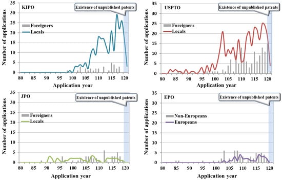 In addition, German, Danish, Japanese, and Chinese applicants applied for patents in South Korea. The trend in the recent decade was similar to the overall trend. The ratio of locals and foreigners filing patent documents in the United States (USPTO) was 71% (334 cases) for locals and 29% (138 cases) for foreigners. When compared to the US patent document trend with a local application rate of around 65%, which commonly appears in other technical fields, the United States also showed an application trend centered on locals, as in South Korea. However, the proportion of local applicants in the last decade was 66%, suggesting that the proportion of foreigners’ applications has increased compared to the past.