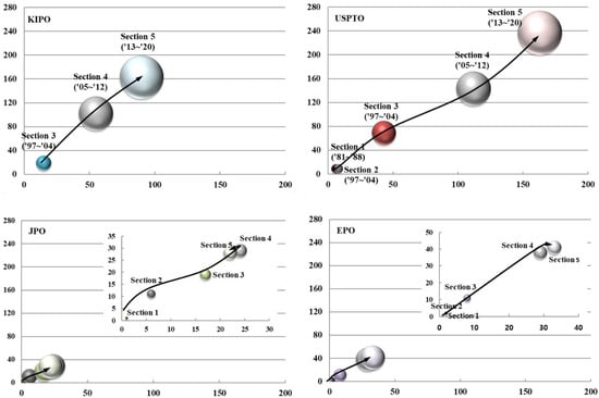 To analyze the patent technology growth stages of target technologies, the entire analysis period of 40 years was divided into five periods of 8 years. In Figure 5, Section 1 (1981–1988), Section 2 (1989–1996), Section 3 (1997–2004), Section 4 (2005–2012), and Section 5 (2013–2020). The growth stage of target technologies based on patent technologies can be interpreted as a period of growth in which both the number of applications and applicants increase on the graph. In particular, the number of applications and applicants tends to increase significantly from Section 3 to Section 4. Overall, it exhibits the shape of the growth stage.