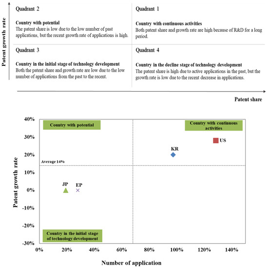 The characteristics of the relative application trend in each major nation can be found by concurrently analyzing the recent patent document growth rate and application share compared to the past for each major country (Figure 6). The patent share is the ratio of the number of patents for each given technology to the total number of patents. The patent growth rate is the 10-year average value of the compound annual growth rate (CAGR) of patents. The patent document trend and technical characteristics based on the location of the specific technology were assessed by presenting each value of the patent share and the growth rate by major countries on the X-axis and Y-axis. If the country’s patent share and growth rate are in the first quadrant of the graph, it is assumed that it has constantly active patent documents. If it is in the second quadrant, it is assumed that patent documents have become active recently. If it is in the third quadrant, the country’s technology is considered to be in its early stages. If it is in the fourth quadrant, it is assumed that patent documents are recently declining. However, the analysis based on each major country’s patent share and growth rate is a relative comparison and should not be interpreted as an absolute interpretation of the target technology.