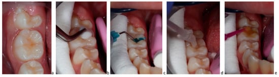 (a–e) Clinical application of P11-4: (a) initial active carious lesion in a permanent molar; (b) cleaning of organic debris with 3% sodium hypochlorite; (c) etching with 35% phosphoric acid; (d) application of P11-4 and waiting for 3–5 min for diffusion into the lesion; (e) fluoride varnish application.