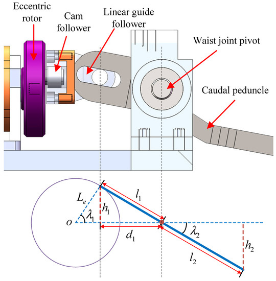 Point O in Figure 2 represents the center of the eccentric rotor, which corresponds to the waist motor shaft. The horizontal extension line from O coincides with the extension line of the motor shaft and marks the boundary between the up-and-down flapping of the caudal peduncle. The rotational axis of the waist joint also coincides with the motor output shaft. represents the vertical distance from the cam follower to the axis of the motor output shaft. The linear guide follower moves up and down and touches the caudal peduncle. represents the distance from the contact point to the axis of the waist joint. The caudal peduncle is designed with a slot at the end to match the movement of the cam follower, which means that varies with movement. represents the horizontal distance from the cam follower to the axis of the waist joint. According to trigonometric functions, we have