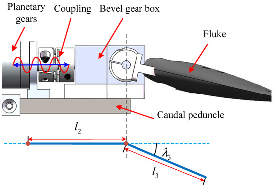 Figure 3 illustrates the schematic diagram of the caudal structure. The fluke is driven through a 1:1 bevel gearbox by the caudal motor. The caudal joint angle is obtained by position encoder feedback. This caudal joint has two characteristics: firstly, the fluke flaps up and down, and both the upper and lower position limits are 70; secondly, restricted by the mechanism, the fluke reverses at the amplitude extreme, meaning that the caudal motor has to change the motion direction in each cycle.