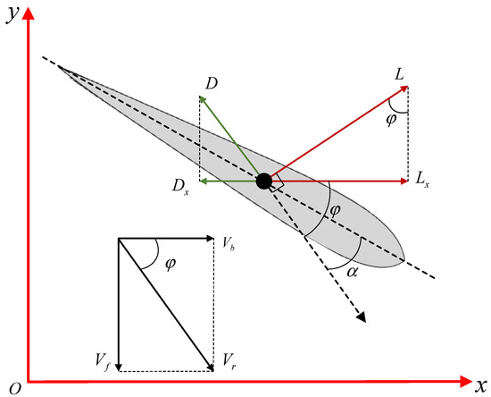 The angle of attack is the angle between the plane of the fluke and the direction of water flow, which is a key variable in determining the propulsive force generated by the fluke. Figure 4 shows the relationship between the AoA and the forces acting on the fluke. The fluid forces acting on the fluke in water can be divided into two components: lift L perpendicular to the direction of motion and drag D parallel to the direction of motion. Here, the direction of motion is the absolute velocity of the fluke in the real world, which is composed of the forward velocity component and the lateral velocity component . Ignoring surface friction, pressure drag, and gravity, according to the lift–drag model, the force acting on the fluke can be represented as