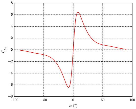 where is the lift-to-drag ratio of the fluke. Referring to the lift and drag coefficients obtained from the CFD simulation in Section 2.3, the curve of is as shown in Figure 5. According to Equation (4), the maximum lift coefficient of the fluke is achieved at , but the maximum lift-to-drag ratio of 6.44 occurs at . Substituting these data into Equation (7), we obtain