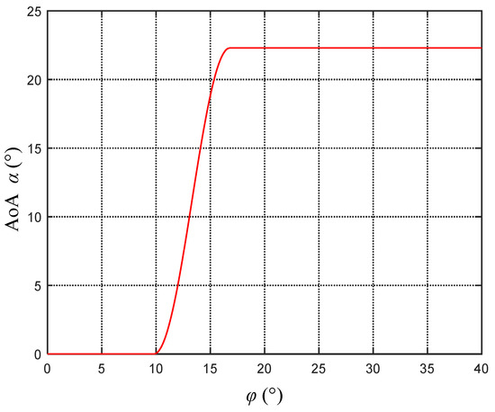 where , , and . For ease of understanding, Equation (9) will be referred to as the optimal AoA control law model in this section. The relationship between the AoA and is illustrated in Figure 6.