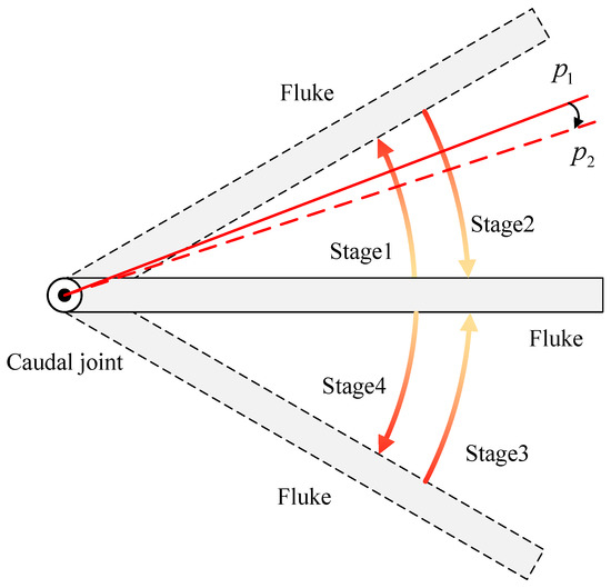 Considering the actuation frequency limitation of commonly used direct current (DC) motor profile position (PPM) mode, we choose to control the torque of the tail motor and use the cycle synchronous torque mode (CST) of the motor driver to realize joint angle control. A schematic diagram of the fluke movement under CST mode is presented in Figure 7. In this mode, the swinging motion of the fluke within a single cycle is also divided into two stroke phases (stage 2 and 3) and two return phases (stage 1 and 4). In the stroke phase, as the caudal joint angle increases, the output torque of the motor also increases. The reverse process takes place during the return phase, where the motor torque gradually decreases. The above process is similar to adding an adjustable-stiffness torsion spring at the caudal joint, with the stroke and return phases being similar to the processes of energy release and storage of the torsion spring. However, fundamentally, both processes consume energy from the motor, and the motor can adjust the energy storage at any time as needed.