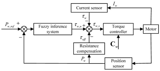 In brief, the control algorithm for the caudal joint in torque mode is illustrated in Figure 8. Firstly, the deviation between the desired value and the current position returned by the motor position sensor is obtained. Secondly, a fuzzy inference system is designed to map the current position deviation to the underlying motion parameter . Then, the current position is input into a friction compensation model to calculate the friction force and the restoring force of the latex skin, and then output the compensating torque . Next, the desired torque , compensating torque , and current actual torque are combined to form the actual torque setpoint . Finally, the torque controller integrated within the motor drive converts and other motor parameters into control signals for the caudal joint motor. It is worth noting that the “torque controller” depicted in Figure 8 is provided by the motor manufacturer and is embedded within the motor drive board, ensuring that the motor outputs the desired torque according to the given command. With the above controller, the fluke continuously moves along the desired trajectory and eventually flaps in coordination with the waist joint to achieve forward swimming.